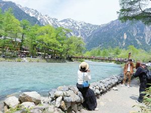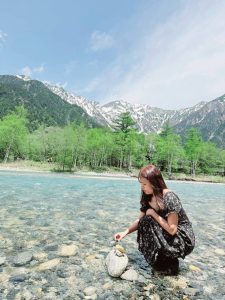 「上高地は日本に来ては初めて行った旅行でした。川の水の色はとてもきれいで、山は高くて5月になるのに雪がまだ残っていた。